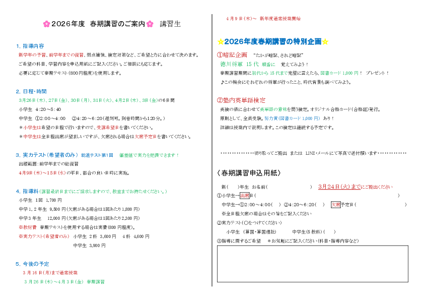 ②春期・夏期・冬期の指導料、実力テスト料、検定などの受検料は別途
